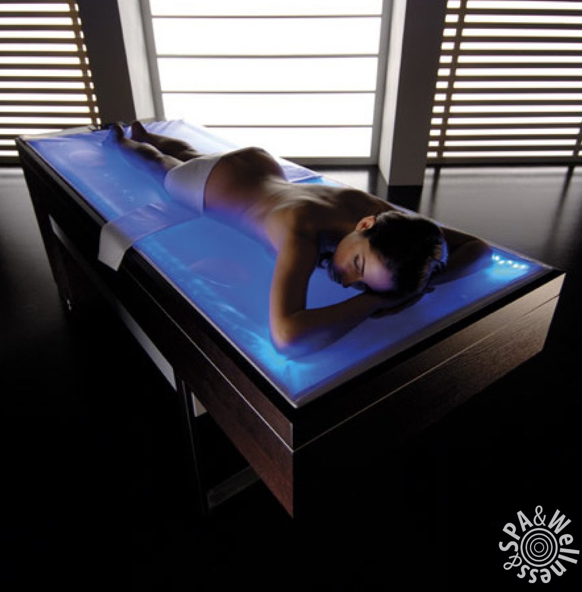 С помощью данного универсального SPA- ложа можно легко проводить разнообразные SPA- процедуры: сеансы талассотерапии, грязелечения, пилинги, обертывания, массаж. Ни клиент, ни оператор не контактируют с водой. Оператор может вручную регулировать температуру воды и выбирать цвет.